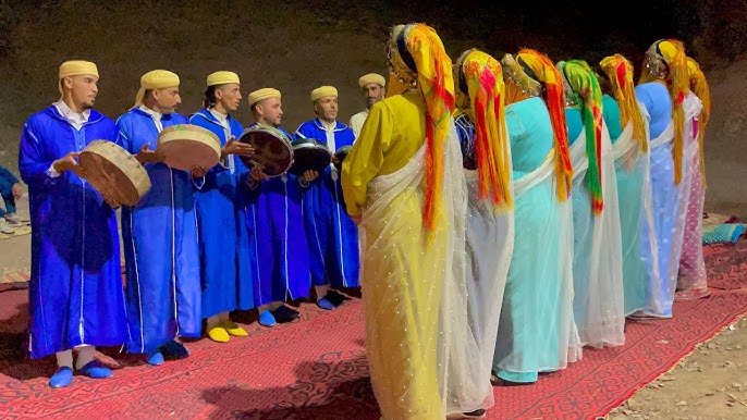 La música es el alma de la fiesta. Una orquesta (el-jok) toca en directo, alternando música tradicional con ritmos más modernos . Dependiendo de la región, se escucharán estilos como el Ahidous (bereber del Atlas), el Deqqa Marrakchia (de Marrakech) o la Taqtoqa Jabalia (del norte) . La comida es un festín: se sirven pastelas, cuscús, mechoui (cordero asado), brochetas y una gran variedad de dulces como la baklava y los cuernos de gacela, todo regado con té a la menta .