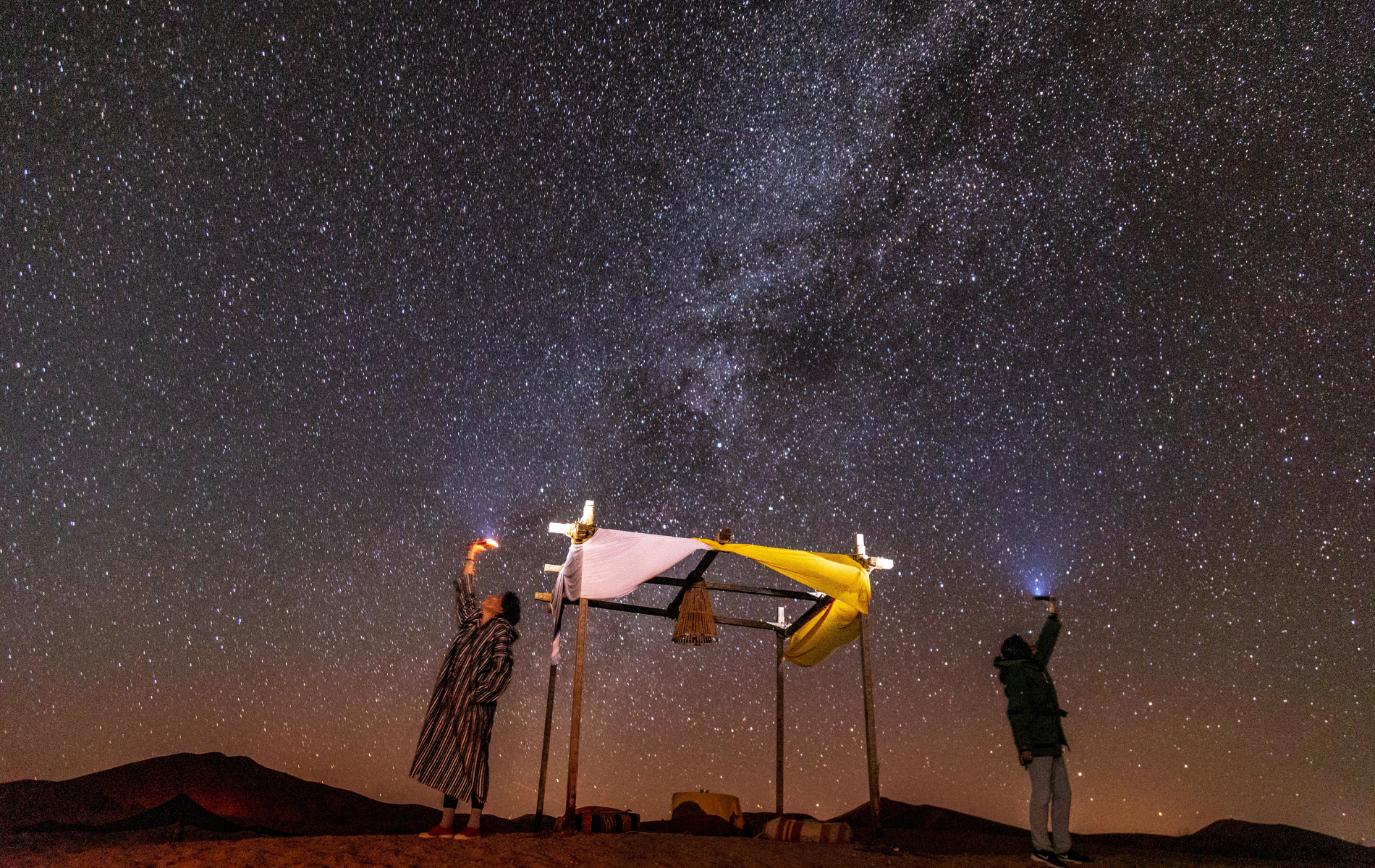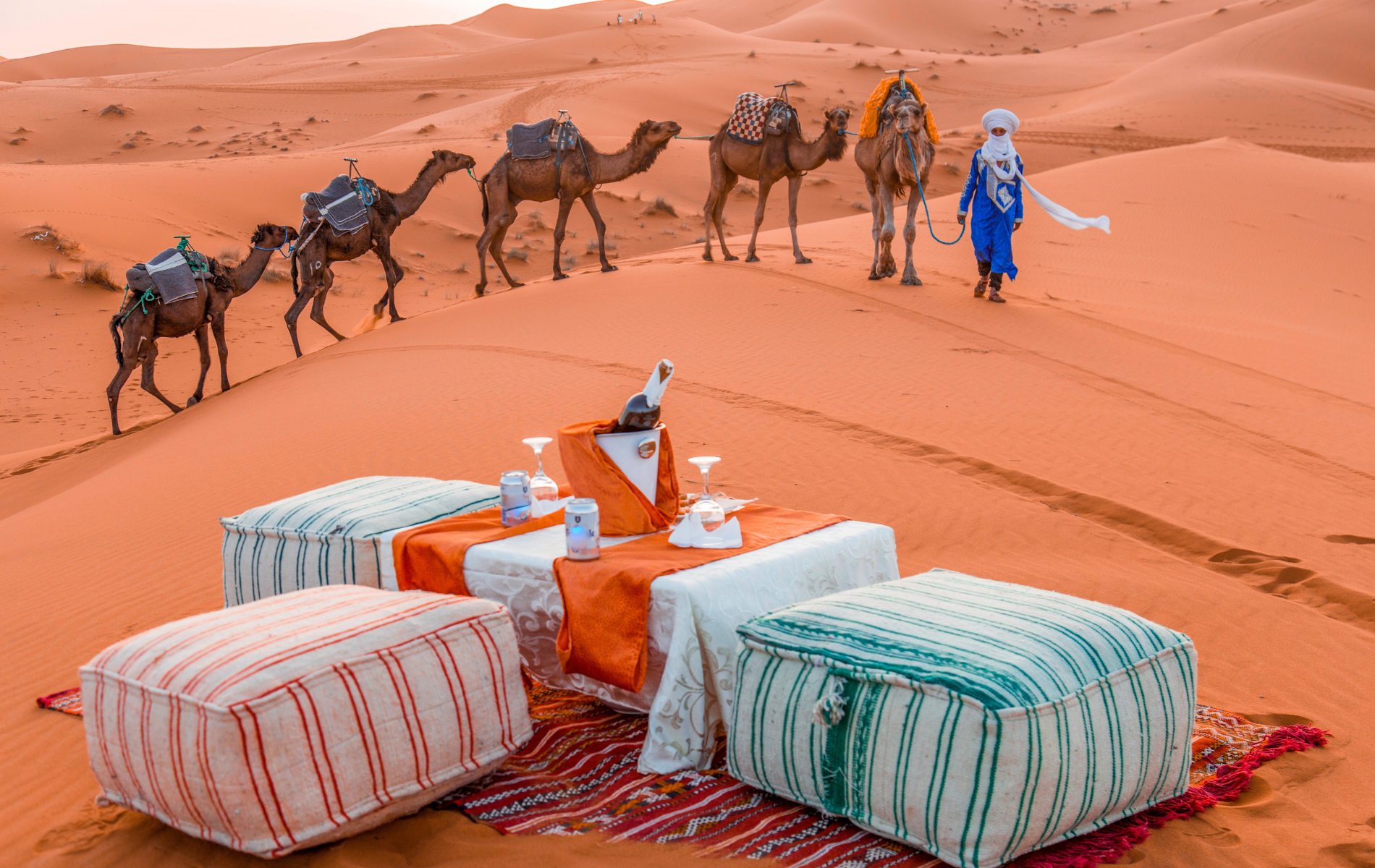 A continuación, montará en camello hasta el campamento del desierto, donde pasará la noche y se relajará mientras toma un té marroquí a la menta. Después tendrá tiempo para pasear por las dunas cercanas y contemplar el impresionante paisaje. Después, degustará una deliciosa cena bajo las estrellas, escuchará música bereber interpretada por nómadas locales alrededor de la hoguera y, si le gusta bailar, podrá hacerlo al son de música bárbara antes de dormirse bajo las estrellas. Pasaremos la noche en un campamento del desierto.