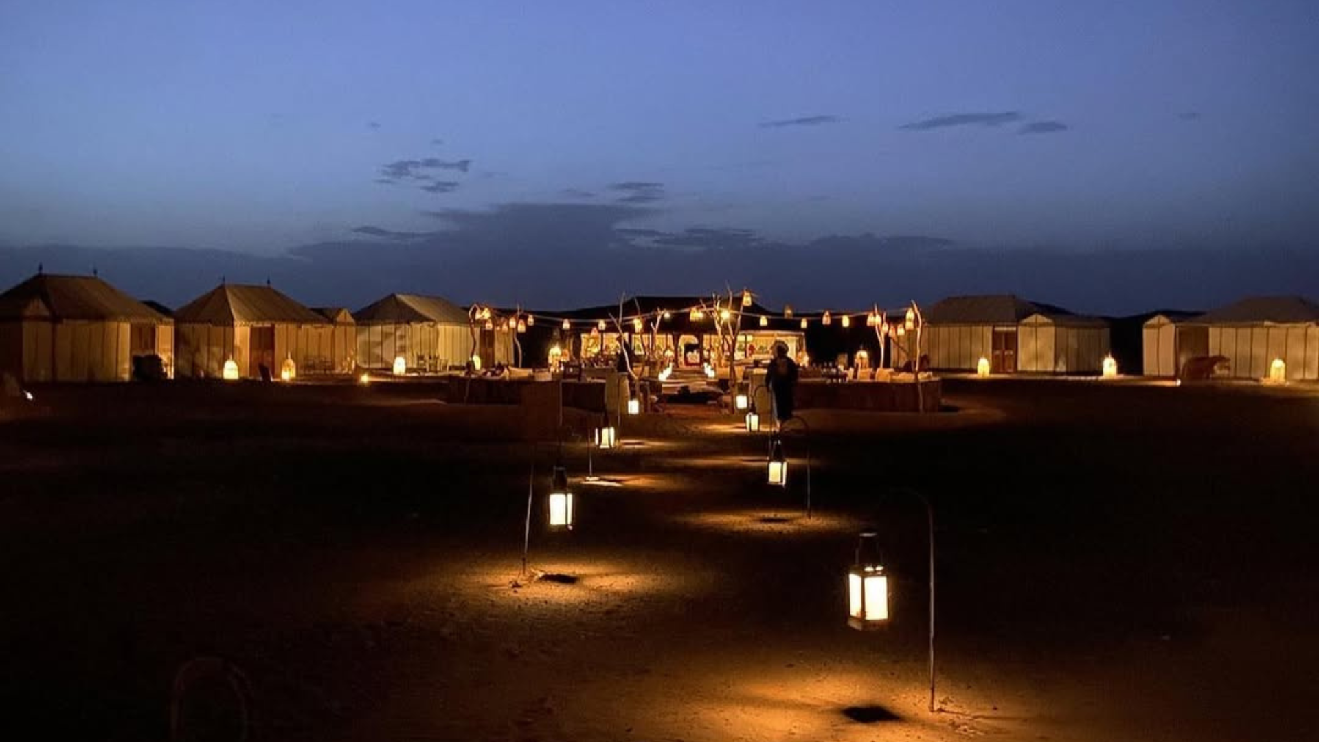 Aquí comienza la experiencia más esperada: un mágico paseo en dromedario al atardecer por las dunas de oro del Sáhara. Alcanzarás un auténtico campamento bereber de lujo, donde te recibirán con hospitalidad. La noche es pura magia: cena tradicional bajo un cielo estrellado, al ritmo de música de tambores bereber y la serenidad absoluta del desierto. Dormirás en una cómoda y bien equipada jaima tradicional.